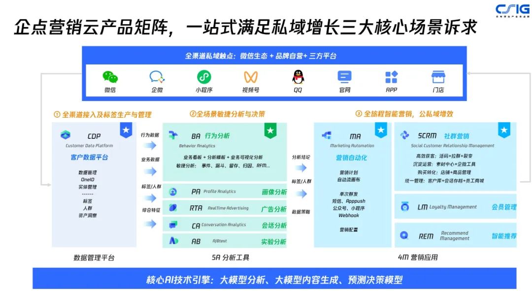 2024,中国企业的营销增长模型在哪?发表时间:2024-01-30 18:50 ![]() 不论是从CDP到MA再到SCRM的一体化工具,还是其中的AI等智能化能力,腾讯企点营销云试图加持的,是在新的“人货场”关系下的企业智能化营销能力。 2024年,新的营销增长模型在哪里?一体化、智能化、数据化,恰是腾讯企点等企业给出的答案。 作者| 皮 爷 出品|产业家 一家会员数4500万、全网粉丝数超过8000万的公司应该怎么做增长?这是来伊份在过去几年时间里一直面临的难题。 伴随着数字营销时代的到来,对越来越多企业而言,如何精准地进行营销进而实现品牌增长愈发成为企业的头号任务,其中除了从公域到私域的转化命题,更为核心的挑战来自于私域的建立和运营策略。 “过去市面上提供的营销工具更多的只是会员管理系统,也就是如何把人从公域吸引过来,到我们的企业微信或者公众账号上,但下一步呢?下一步应该怎么做?没人能做好。”一位零售企业的门店负责人告诉产业家。 这是一门“技术活”。即在企业微信等成为私域的核心载体的同时,如今市面上始终缺乏如何进行私域这个环节精准运营的服务,以至于尽管企业有私域,但更多的是作为一个“宝山”,对企业而言经常是空手而归。 从技术的层面来看,其对应的是从数据到业务的准确表达。“这个很难,中间需要的是桥梁型人才,既需要懂业务,也更需要懂数据。”来伊份技术总监吕华表示。 在这句话背后,对应的是一系列 “业务+数据”逻辑,CDP、数据清理、用户标签、BA(行为分析)、MA(营销自动化)……等等,对企业而言,这不是一个单纯的业务问题,而是一个数据技术问题。 难题在哪?或者说,在固有的业务框架之外,企业的新增长模型到底应该如何建? 一、私域营销:看的见的新确定性, 和摸黑前进的老路 谈及数字化营销,私域是一个避不开的话题。 去年9月,《2024全域运营趋势年度调研报告》发表,其中对私域有几个清晰表达——在报告调研的近2000家企业中,有超过60%的企业表示“私域在整个营收中的占比增加”,此外,更有超过75%的企业表示,在接下来的一年里,将加大对私域的投入力度。 那么,加大对私域的投入力度,到底对应着什么形式? 如果在知乎上搜索私域,在增长这个关键词之外,另外对应的几个关键词是“为什么做私域会屡屡失败?”、“私域的投入产出比例极低”…… 这不是个例。能清晰看到,在企业微信等私域载体被企业关注的当下,一个完整清晰的营销链路尚处于探索期,在前端获客后,对于用户的精细化运营工具,也仍处在初级成长期。 对应到客户层面,对于大型,乃至超大型企业,如来伊份这样的超级零售企业而言,其直观的感受则是“新的增长点受阻”。 从市面上的营销服务来看,过去几年时间里,各家的营销工具服务能力从最开始的前端拓展到了中间层的运营,乃至后端的服务,以更好地满足企业的私域需求。 但其中间,仍然存在诸多“效果不佳”和“落地执行差”的情况。 比如CDP的建立,对不少服务商而言,其不具备足够强的数据实时计算和数据标签化的能力,对应到用户画像则是标签陈旧,缺乏时效性与更新机制,没办法在实际业务场景中赋能实际业务。 再比如从数据中台到营销中台,即使建立了CDP的能力,但对应到营销策略和营销动作的执行,其执行仍需要大量人力参与,原本的RPA等工具效果不佳。企业如果想要执行效果好,则可能需要招聘人力,中间会产生巨大的成本。 从另一个视角,也能清晰地看到,不论是CDP厂商,还是CRM、SCRM,乃至营销自动化服务商,过去多年时间里更多是基于单点能力的加持,但对于全域流量行为、消费者促销互动与行为偏好数据乃至成交的整体流转,从数据到业务的表达,始终缺乏一个清晰的全链路服务。 确定性的趋势,确定性的问题。营销这道题下一步应该如何解?或者说,伴随着AI时代的到来,这道综合性的系统工程是否能有一个新解? 二、一体化、智能化里的营销全周期模型 在刚刚过去的腾讯产业合作伙伴大会期间,一个营销云的产品矩阵被腾讯企点首次放到台面上,其核心锚点基于智能化的方式驱动私域增长。 “之前腾讯企点也有营销这块服务,但这次公布的模型和案例都更详细。”一位行业人士告诉产业家。 具体来看,在这次腾讯企点推出的营销云产品中,可以看到的是一个集合AI能力、一体化营销流程的完整体系——以CDP、BA、MA、SCRM等几个核心产品为节点,基于各个产品的能力串联起的整个营销体系模型。 其中,不论是对于CDP建设中的数据接入、标签划定,还是从数据连接到行为数据的业务分析,再或者是营销中台阶段的营销内容制定等等,都依托于大模型等AI技术,进而做到整个营销流程的智能化。 从产品形态和AI能力来看,其主要解决的恰是前文中提到的几个营销核心卡点,如营销一体化的断点、用户画像和标签定义的不准确,以及营销内容的“个性化”制作和分发等等。 在一体化矩阵和大模型的驱动下,这些固有的卡点都有了更清晰的回答。 ![]() 实际上,来伊份也正是这套体系的实践者。其基于腾讯企点营销云,对4500万门店会员、8000w账户粉丝进行了更为精细化的管理、运营和沉淀。 在这套体系的支撑下,不论是对于线上营销的管理,还是对会员体系的梳理,以及对包括门店的管理,对来伊份而言都有了更强的数据支撑。从真实业务场景来看,依托腾讯企点营销云,
