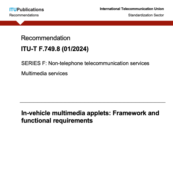 腾讯主导制定全球首个车载小程序国际标准,助力车载应用生态发展发表时间:2024-02-02 11:36 2024年1月,国际电信联盟标准部门(ITU-T)正式发布了由腾讯主导制定的《F.749.8 In-vehicle multimedia applets: Framework and functional requirements》(车载多媒体小程序框架和技术需求)国际标准。