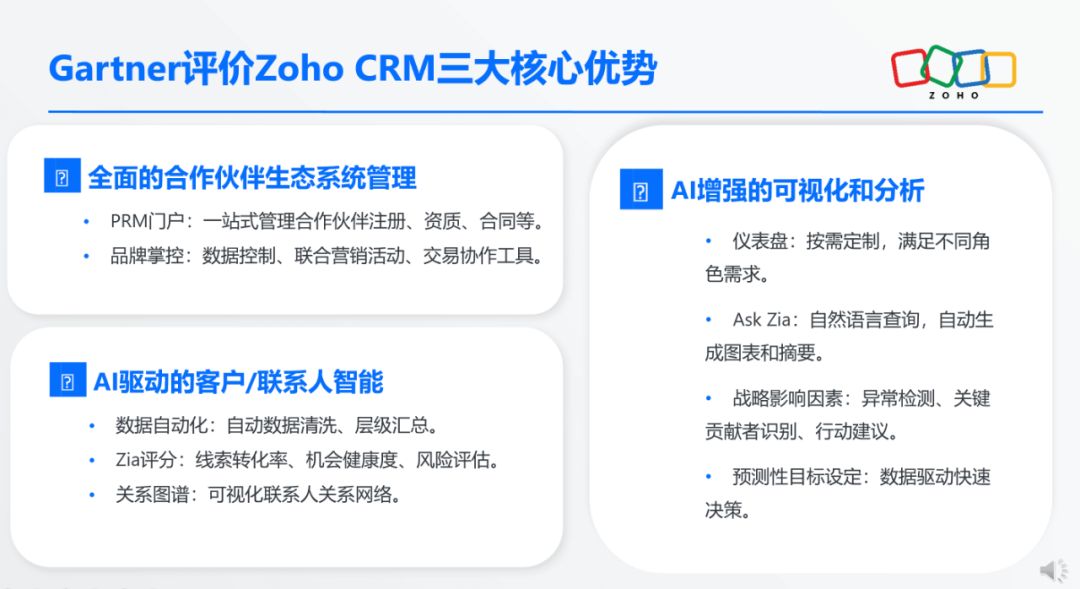 Zoho,用“长期主义”求解AI CRM发表时间:2025-09-16 14:27 ![]() AI的真正价值是什么?在软件加速进化的如今,这个问题更应该有清晰的回答。 客观来看,它不应该是FOMO情绪的一拥而上,对Agent的盲目布局和选择,它更应该被选择的理由是真实的生产力价值、真实可用可转化为业务价值的产品加持,而这些也正是Zoho在CRM一系列产品中所展现,也更是被选择的点。 作者|皮爷 出品|产业家 “我们觉得现在这些AI能力都是之前就具备的,而且是已经在实际使用的。”Zoho CRM产品市场总监胡佩瑶告诉我们,“所以我们更多是开放给客户使用,没有特别对外传播。” 她口中的这些“早已经具备的能力”不是单纯的AI Agent,而是企业在使用Zoho CRM时,在不同的节点都分别会弹出来的AI元素,比如线索智能分配、比如客户流失分析预警、比如整体数据分析汇总洞察,以及邮件、文档自动撰写、合规管控等等。 在实际落地中,这些能力可以分别加持CRM相关的不同角色,从销售到运营到产品甚至企业CXO。 从某种角度来看,胡佩瑶眼中的“普通”,也正是如今中国市面上主流SaaS产品希望做到的AI效果——通过把AI真正内嵌到产品内部,帮助不同岗位的角色提效增质。 AI对于SaaS产品的价值到底是什么?或者说对CRM、ERP等企业核心管理软件的颠覆到底会在哪里? 大模型在中国兴起的两年时间里,关于这些问题的回答不在少数。有人崇尚AI颠覆论,比如“所有的企业环节,都要用Agent重做一遍”;有人倾向于潜移默化的底层加持,即在既有SaaS产品的基础上,通过AI做加分项。 正确答案应该是什么?就CRM这种在中国市场已经成长几十年的核心管理软件而言,它在AI浪潮里的新评判标准已经成型了吗? Zoho是一个样本。在这家企业身上,其具备的不仅是深耕CRM多年的企业软件沉淀,也更具备如今“区别于”一众AI产品和软件厂商的真实有效的AI能力和模块。 ![]() 在2025年的落地和生态动作中,这个价值尺度正在被它清晰呈现。一组组清晰的增长数字背后,一个恒定的TO B准则也恰在悄然浮现:长期主义,在如今变化迅速的AI时代,依然成立。 一、“CRM依然是本位项” “其实过去这一两年,在我们所有的执行项目里,企业更多关注的还是CRM本身。”胡佩瑶告诉产业家,“AI一定会被客户提及,但更多是加分项。” 在AI浪潮不断翻涌的当下,这种体感足够特殊,但却又足够真实。 即从如今的AI Agent产品分布情况来看,其仍然很难在企业内部完成生产力式的落地,不论是从Agent构建环节,还是自身的数据体系不完善,再或者是没有足够的能力完成微调等等,它们构成着如今Agent在企业内部的真实水温。 胡佩瑶的感知也恰是如此。根据她介绍,在过去的两年时间里,尽管越来越多的企业开始决定投入AI,但CRM软件的能力本身仍然是大部分企业的核心关注重点。 不过,这种主战场也更存在些许变化。 她告诉产业家,相较于前几年的项目标的,如今越来越多项目的决策周期变得更长,比如最近Zoho中标的某国内头部食品企业的CRM项目,其从最开始立项到POC测试再到最终中标,整个过程持续了超过3年。 “客户必须眼见为实。中间过程中拉着我们售前人员和他们每一个部门的人都分别对接演示,以保证产品在企业内部可以直接被用起来的,Zoho CRM强大的定制能力可支持快速响应。”胡佩瑶表示。 这种“长周期”对应的是越来越多企业对于如CRM等核心管理软件的愈发个性化需求,即对不同的行业而言,其对应的售前售中售后的环节差异性极大,此外,对不同的公司而言,CRM等核心管理软件也最好能适配公司的自身的架构业务流程,以可以真正加速前端业务流转效果。 这种谨慎是必然的。一个长期存在中国数字化行业的真实情况是,不少服务商尽管在POC等演示环节展现出不错的数字化整合能力,但在真正的交付和执行过程中很难对公司的某些个性化需求进行满足,由此也就催生出一系列“数字化烂尾工程”。 不仅于此,如果说个性化、行业化对应的谨慎是基于企业自身的属性,那么关于CRM,越来越多企业还有更深一层的考量——把CRM产品作为一个真正的集团中台,把包括协作办公、客户线索管理、产品管理、运营研发等等流程全都“挪”到CRM软件中,将其从一个销售管理软件正式转化为一个企业中枢中台的角色。 “这也是我们和这家企业接触这么长时间的原因,基于企业的这种中枢平台的新定位,我们前端的销售人员和运营人员需要做和之前不同的交付和服务,帮助企业完成这种定位。” 这种使用恰是基于Zoho今年的新产品,即Zoho CRM for Everyone全员版,其将 CRM 从销售专属工具,升级为企业级客户运营协作平台,企业可按需创建销售、市场、法务、售前、售后等独立团队空间,各个团队在专属空间定制契合自身业务的模块。 ![]() 在Zoho经历的“特殊时间周期”和选择标准背后,也恰对应着中国CRM市场的新规则:即中国软件选型,已然进入一种绝对的“良币驱逐劣币”的周期,企业不再单纯唯价格论,而是更多把CRM本身的产品能力、集成属性、前端界面作为第一衡量标准,进而推进最终的选型决策。 那么,AI侧的需求呢?或者说,在Zoho被选择的CRM的需求之外,AI真的只是加分项吗? 二、真正的AI价值到底应该是什么? 关于AI,在产品之外,这也正是Zoho所探索的事情。而如果从时间线来看,这个探索的时间甚至早于生成式大模型浪潮的来袭。 早在生成式AI爆发的8