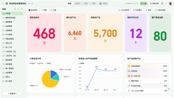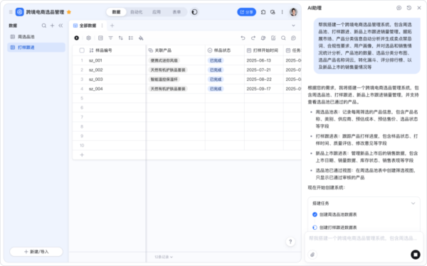 AI表格的AI小助理,一句话就能生成表格、自动化工作流、数据大屏 在8月25日的新品发布会上,钉钉宣布基于30万家企业客户的真实共创,将AI表格升级为AI时代的应用创建平台。围绕该升级,AI表格带来了全新视觉、全新交互,以及AI表格助理、字段Agent多项重磅AI能力。 钉钉AI表格助理正式上线后,用户只需自然语言对话描述想法,它就能按要求自动生成AI表格、自动化工作流以及数据仪表盘分析,创造出一个个真正可用的AI应用,大幅降低AI表格的使用门槛,人人都是AI应用的创造者。