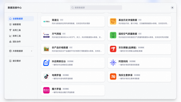 字段Agent目前已真实应用到企业的经营生产中。例如山东魏桥创业集团在AI表格中搭建了AI安全巡检系统,巡检工人拍照提交后,字段Agent可识别照片信息,再由AI逐一完成从隐患描述到整改建议的多个环节的分析,整改通知还会通过自动化工作流推送到部门负责人、整改人,直接降低事故率。 此外,AI表格新增了对百炼、Coze等平台工作流的支持,用户可以在百炼、Coze等平台搭建的业务工作流,可一键配置到AI表格,就可以统一完成跨多平台的数据汇总与分析。 数据连接中心上线,一表管理多电商平台的经营情况 钉钉AI表格上线数据连接中心,一次性打通30+高频场域数据,首批可连接的数据源主要包括三类: 1、各大电商平台的商家管理后台,包括生意参谋、阿里妈妈、抖店商家后台、魔方罗盘、电商罗盘等数据源,跨平台管理天猫、淘宝、京东、抖音、唯品会等电商平台数据。