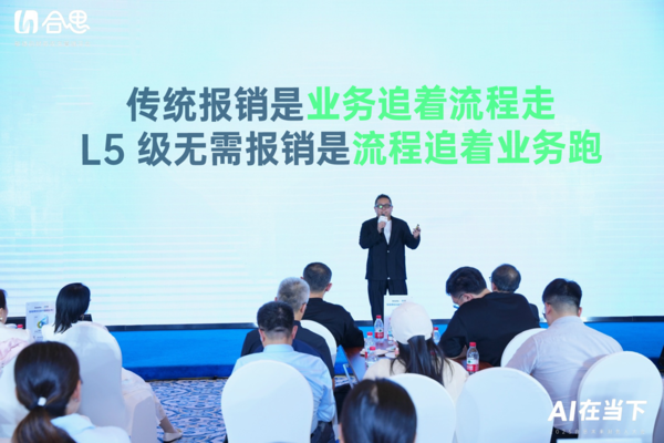 合思CTO 萧培宁 大会现场,合思CTO萧培宁表示,传统报销是业务追着流程走,L5级无需报销是流程追着业务跑。“精准知识理解+合理逻辑推演+高效重复处理”的三重能力组合,让AI成为破解企业报销难题的关键。”