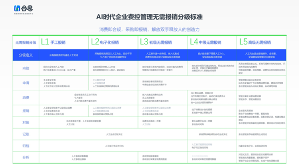 德勤亚太审计与鉴证数字化赋能和AI主管合伙人 金科 大会现场,德勤亚太审计与鉴证数字化赋能和AI主管合伙人金科在现场发布了由德勤与合思共同撰写的《财务管理新纪元:世界一流企业的智能费控卓越之道》白皮书,提出AI时代的全新企业费控无需报销分级标准。“AI 时代的全新企业费控管理无需报销分级标准覆盖申请、消费、报销、对账、记账、归档、以及内控和分析等八大业务关键环节,基于企业在不同费控管理水平下的业务特征划分了五个进阶等级,能够有效帮助企业明确自身费控能力所处的成熟度阶段,找到进阶路径和方法,从而推动企业从L1手工报销逐步迈向L5 高级无需报销。”